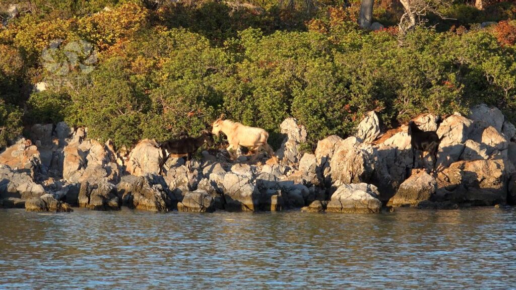From the beach, a steep path leads to the monastery, and goats and wild horses are often seen on the hills above the bay.
